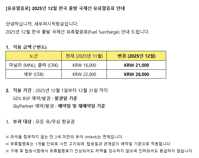 [유류할증료] 2025년 12월 한국 출발 국제선 유류할증료 안내