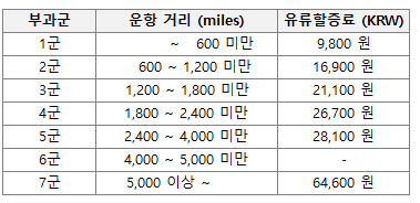 2) 한국발 국제선 유류할증료는 USD로 정해진 금액을 기준 유가 산정 기간과 동일한 기간의 평균 환율을 적용하여 KRW로 환산하여 공지함