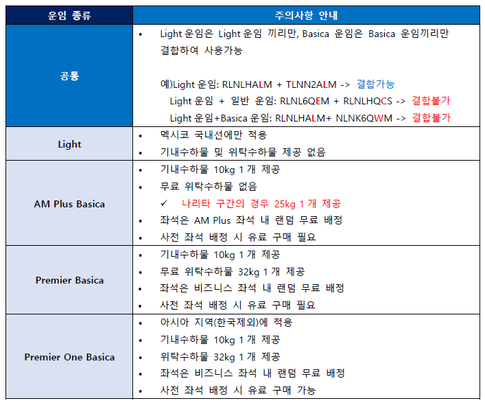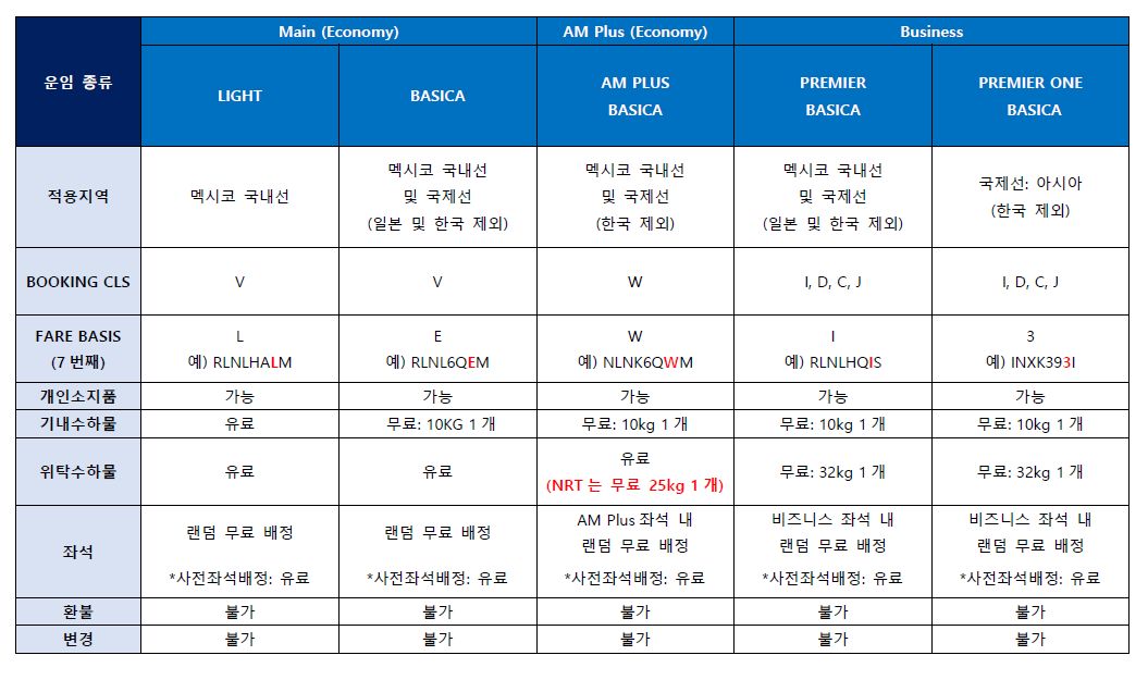 [아에로멕시코] LIGHT 및 BASICA 신규 운임 체계 안내
