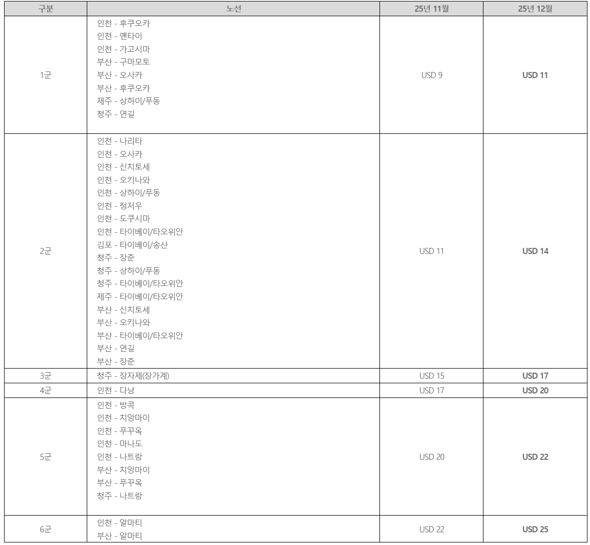 안녕하십니까, 이스타항공 입니다. 이스타항공에서 한국발 국제선 유류할증료를 다음과 같이 안내드립니다. - 다 음 - 1. 적용일: 2025년 12월 1일 ~ 12월 31일 (편도 / 발권일기준) 2. 유류할증료 ( 한국발 유류할증료 )