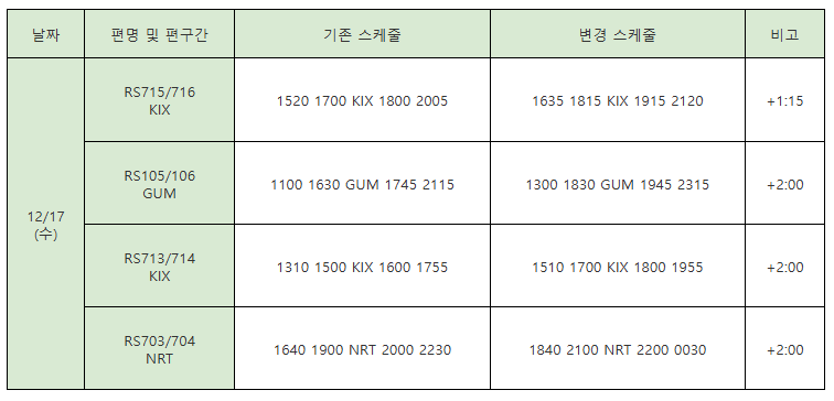 안녕하십니까, 에어서울입니다. 하기와 같이 '25/12/17(수) NRT/KIX/GUM노선 RS703/704/713/714/715/716/105/106편 SKD CHNG에 따른 PENALTY WVR 지침을 공지드리오니, 각 담당자께서는 참고하여 적의 조치하여 주시기 바랍니다.