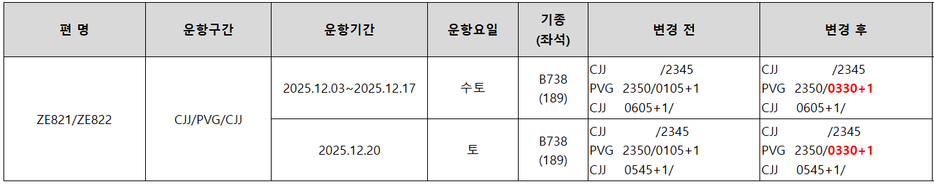[스케줄 변경] CJJ-PVG 출발시각 변경 안내