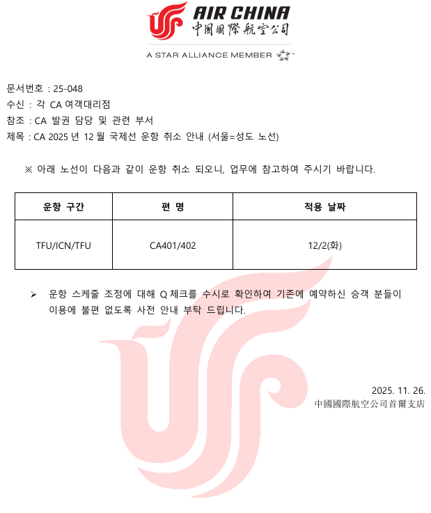 CA 2025년 12월 국제선 운항 취소 안내 (서울=성도 노선)