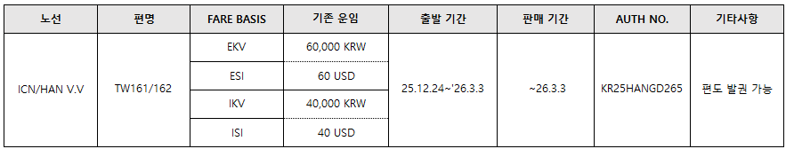 행복을 나르는 티웨이항공에서 다음과 같이 ICN/HAN 노선의 I, E CLS 특가를 안내드리오니 업무에 참고하시기 바랍니다. - 다 음 - 1. 노선별 판매 운임