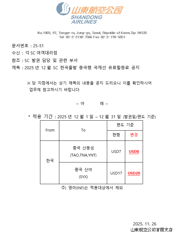 2025년 12월 SC 한국출발 중국행 국제선 유류할증료 공지