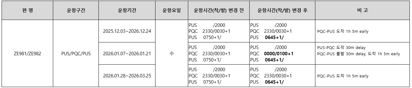 [스케줄변경]PUS-PQC (ZE981/982) 수요일 운항 시각 변경 안내