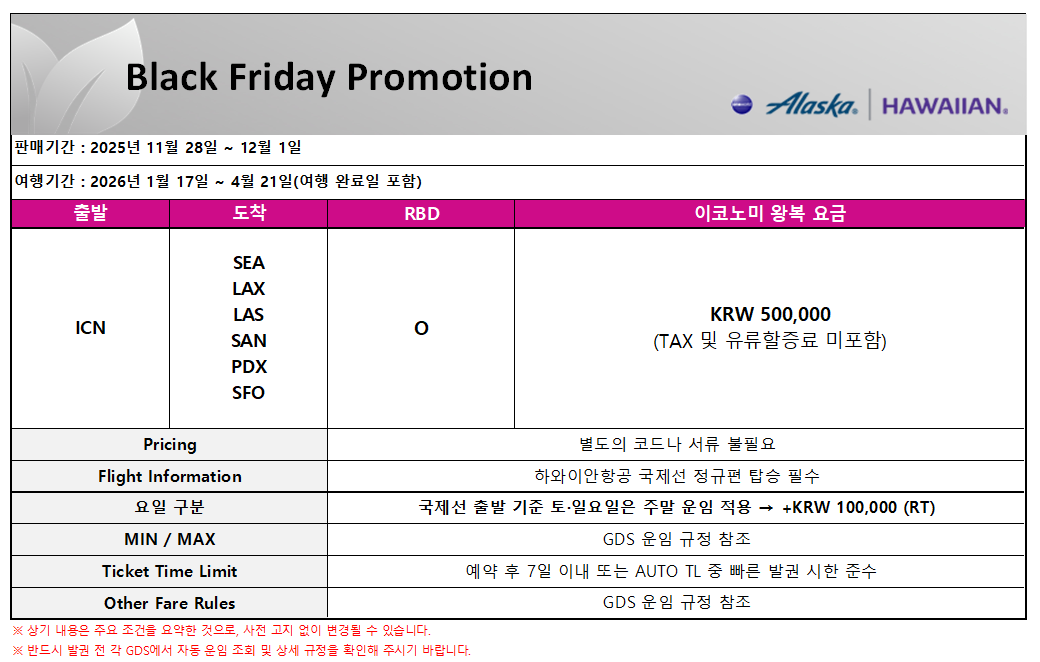 안녕하세요. 하와이안항공 한국지사입니다. 항상 저희 항공편 판매를 위해 힘써주시는 여행사 임직원 여러분께 진심으로 감사드립니다. 오늘부터 4일간 한정으로 예약가능한 특별 운임이 출시되어 아래와 같이 안내드립니다.