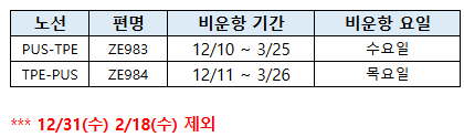 안녕하십니까, 이스타항공 입니다. PUS-TPE v.v 노선 아래 운항 일자에 비운항(CNXLED)되었음을 안내드립니다. 1) 대상 노선 : 부산 - 타이페이 v.v (ZE983/984) 2) 비운항 기간: 2025.12.10~2026.3.26 *비운항 요일 아래 표 확인 요망