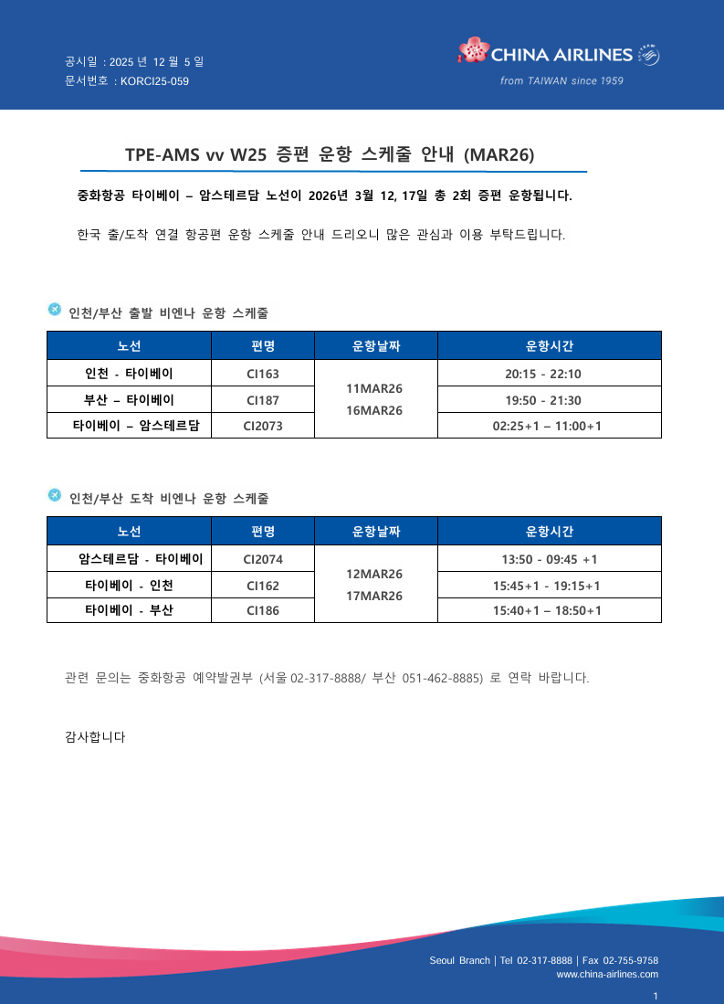 [중화항공] TPE-AMS vv W25 증편운항 스케줄 안내 (MAR26)