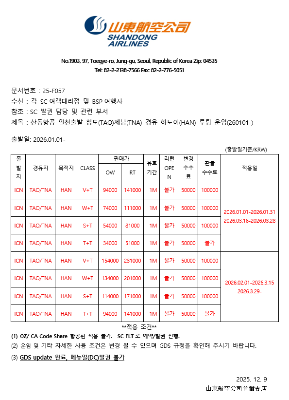 공문25-F057 산동항공 인천출발 청도(TAO)제남(TNA) 경유 하노이(HAN) 루팅 운임(260101-).docx