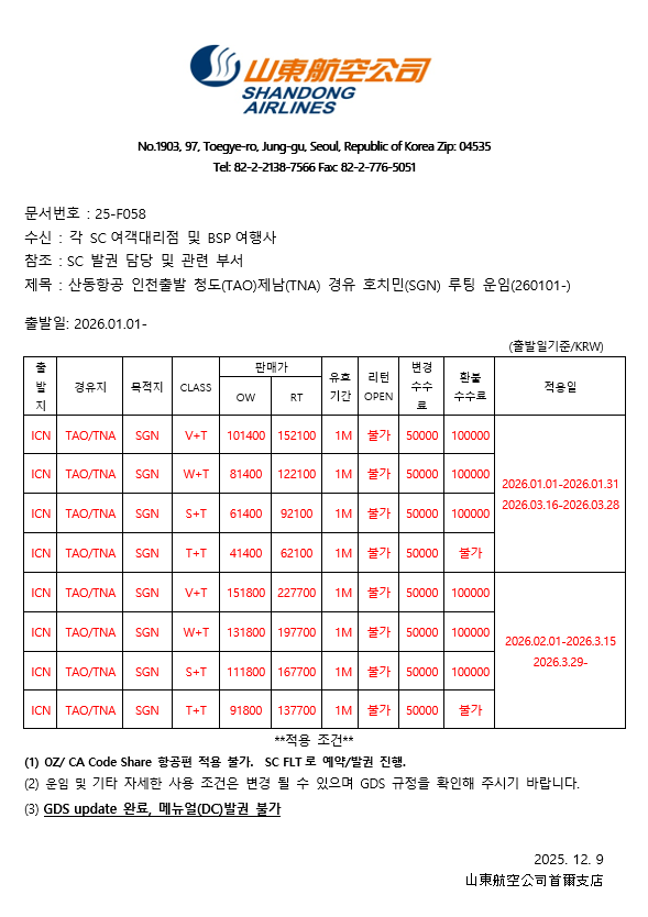 공문25-F058 산동항공 인천출발 청도(TAO)제남(TNA) 경유 호치민(SGN) 루팅 운임(260101-).docx
