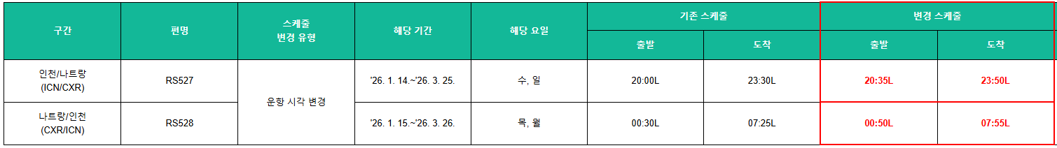 안녕하십니까, 에어서울입니다. 하기와 같이 26/01/14(수)~'26/03/26(목) CXR노선 RS527/528편 SKD CHNG에 따른 PENALTY WVR 지침을 공지드리오니, 각 담당자께서는 참고하여 적의 조치하여 주시기 바랍니다.