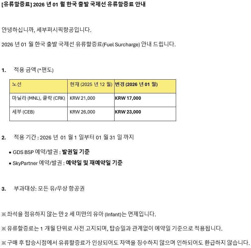 [유류할증료] 2026년 01월 한국 출발 국제선 유류할증료 안내