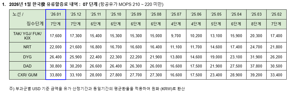 표제 관련 아래와 같이 한국발 국제여객 유류할증료를 통보드리오니 업무에 참고하시기 바랍니다.