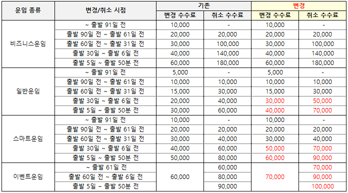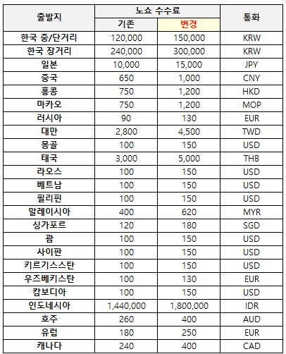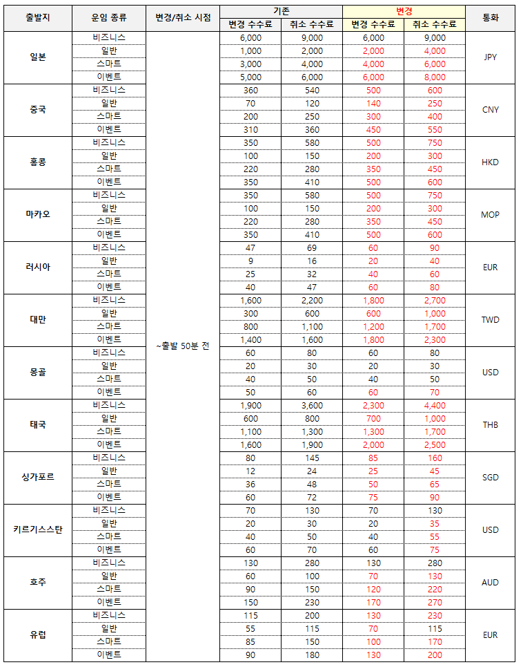 1) 국제선 한국발 단/중거리 노선 변경/취소 수수료 (통화 : KRW)