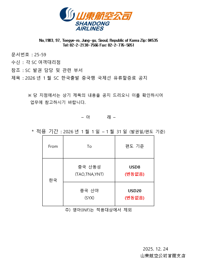 2026년 1월 SC 한국출발 중국행 국제선 유류할증료 공지