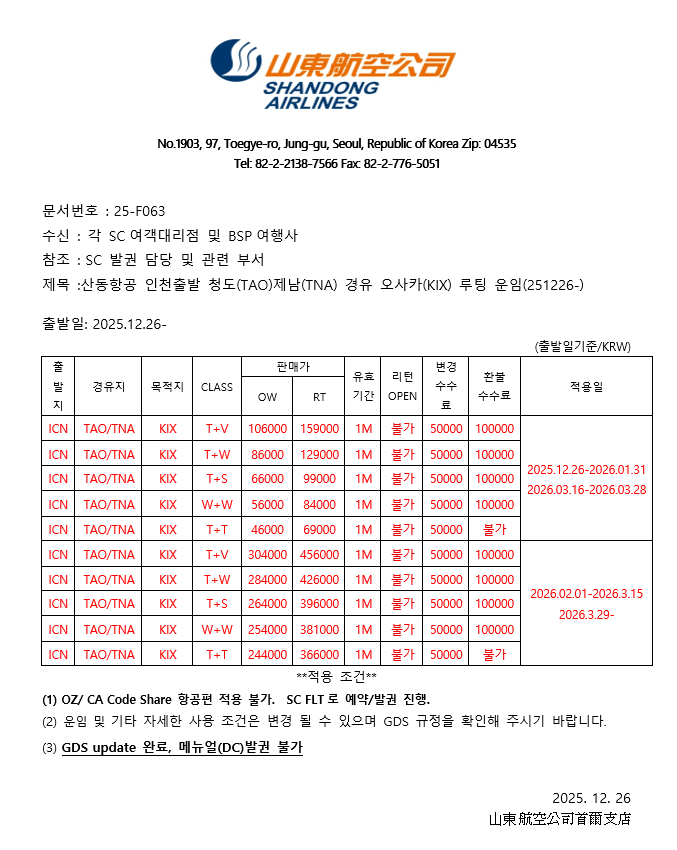 공문25-F063 산동항공 인천출발 청도(TAO)제남(TNA) 경유 오사카(KIX) 루팅 운임(251226-).docx