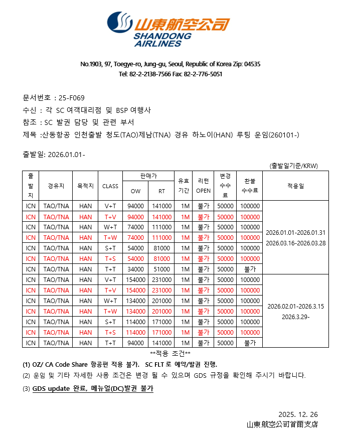 공문25-F069 산동항공 인천출발 청도(TAO)제남(TNA) 경유 하노이(HAN) 루팅 운임(260101-).docx