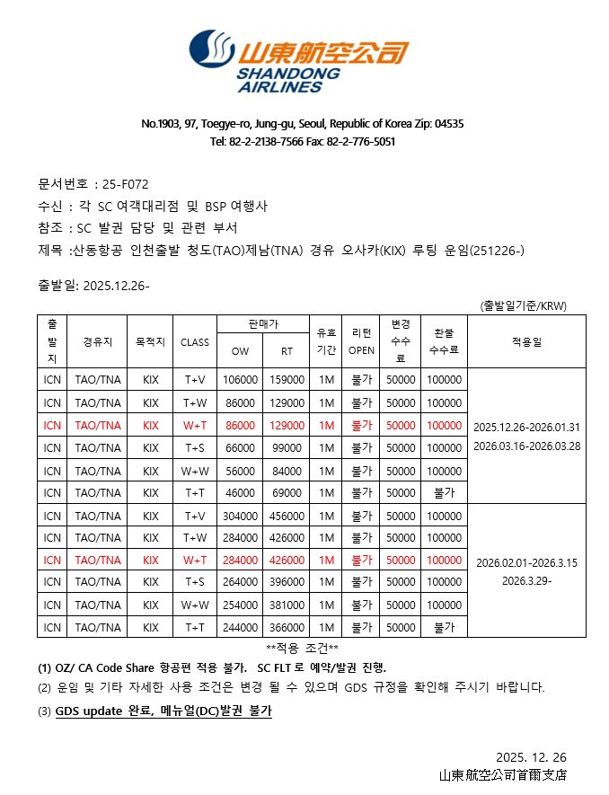 공문25-F072 산동항공 인천출발 청도(TAO)제남(TNA) 경유 오사카(KIX) 루팅 운임(251226-).docx