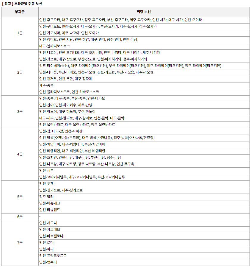 2. 대상 노선 및 유류할증료 (편도 기준으로 적용)