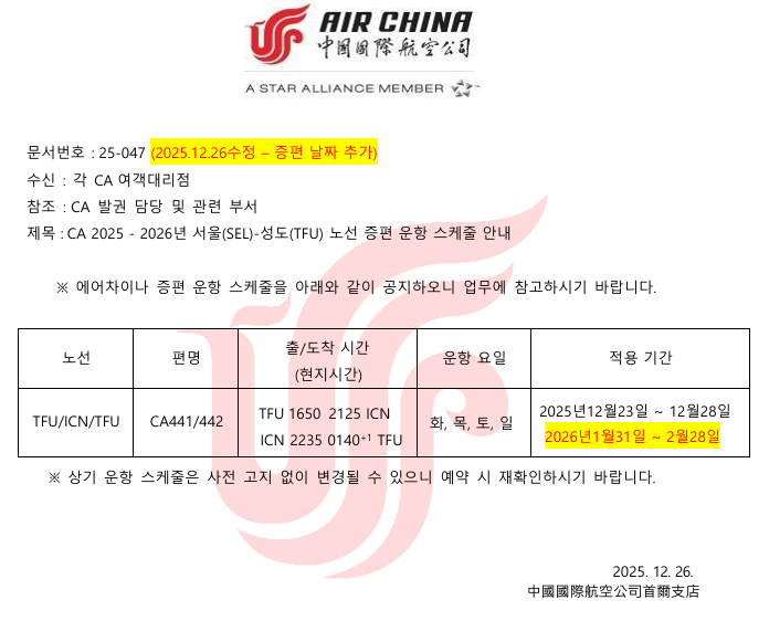 CA 2025 - 2026년 서울(SEL)-성도(TFU) 노선 증편 운항 스케줄 안내 - 251226수정