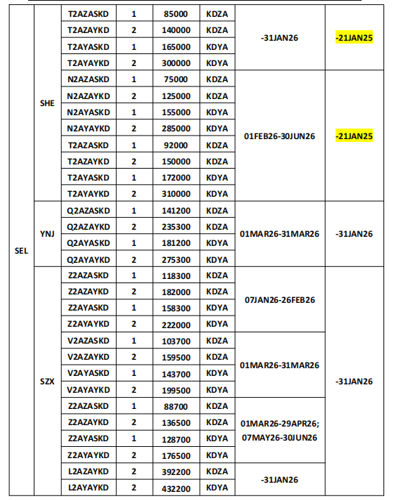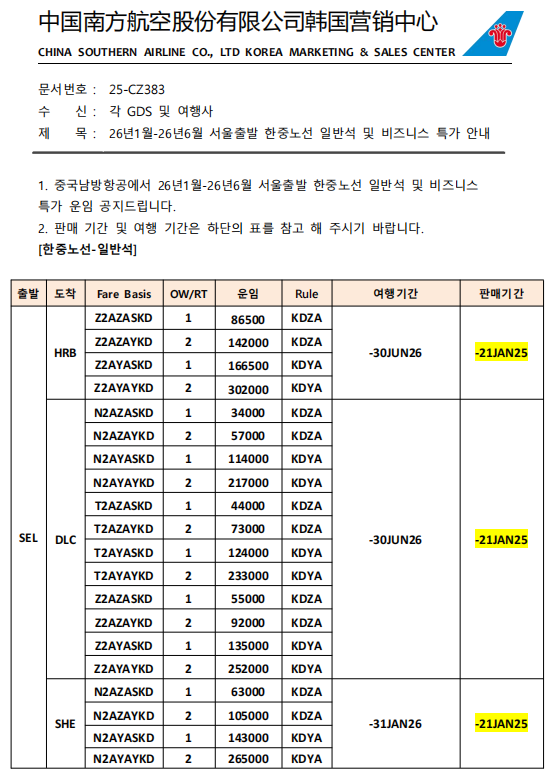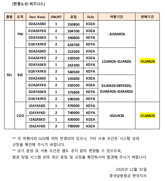 26년1월-26년6월 서울출발 한중노선 일반석 및 비즈니스 특가 안내