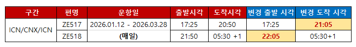 ZE517/518 ICN/CNX v.v 노선 운항 시각이 아래와 같이 변경되어 안내드립니다.
