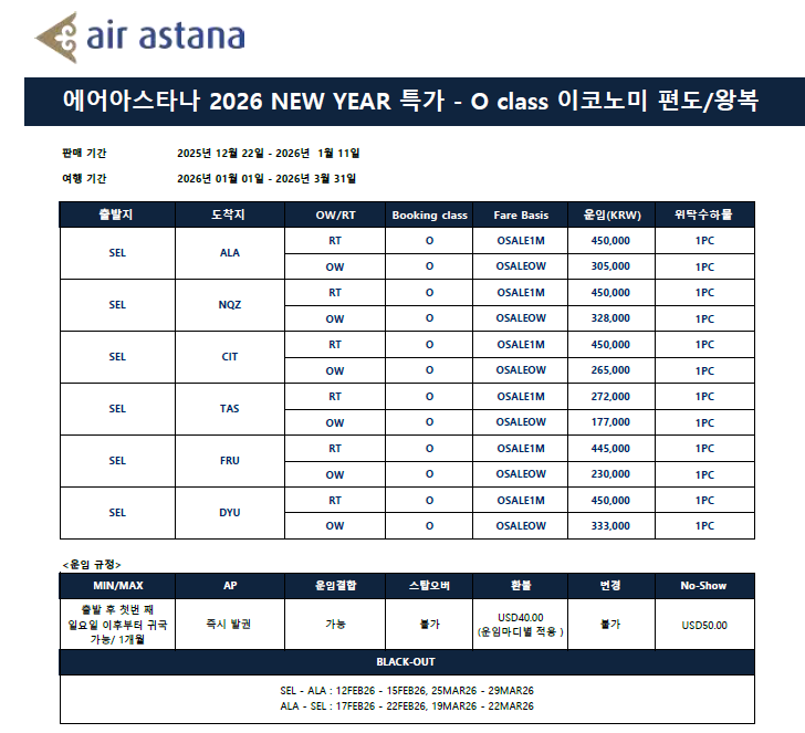 해당 운임과 관련된 문의사항은 에어아스타나 예약/발권 02-724-8854~55 로 문의 부탁드립니다. 기타