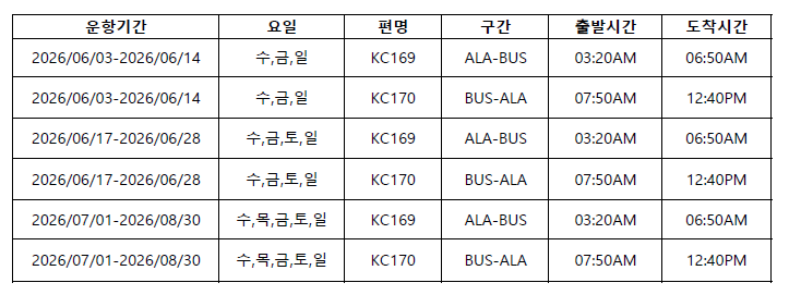 ※ 기간별로 요일이 상이합니다. ※ 모든 시간은 현지시간 기준입니다. ※ 해당 일정은 항공사 사정에 따라 추가 변경될 수 있습니다. KC 910 ICN ALA 1110 1405 KC 169 ALA BUS 0320+1