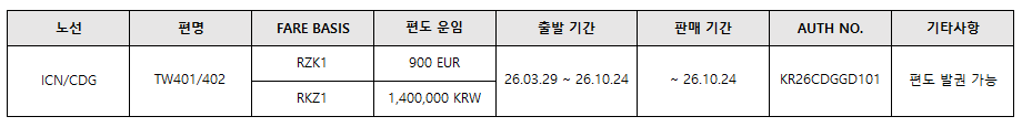 행복을 나르는 티웨이항공에서 다음과 같이 ICN/CDG 노선의 R CLS 특가 안내드리오니 업무에 참고하시기 바랍니다. - 다 음 - 1. 노선별 판매 운임