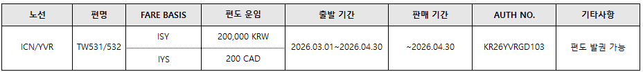 행복을 나르는 티웨이항공에서 다음과 같이 ICN/YVR 노선의 I CLS 특가를 안내드리오니 업무에 참고하시기 바랍니다. - 다 음 - 1. 노선별 판매 운임