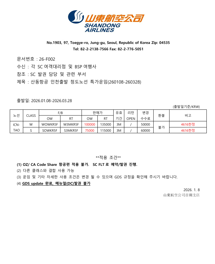 공문26-F002 산동항공 인천출발 청도노선 특가운임(260108-260328).docx