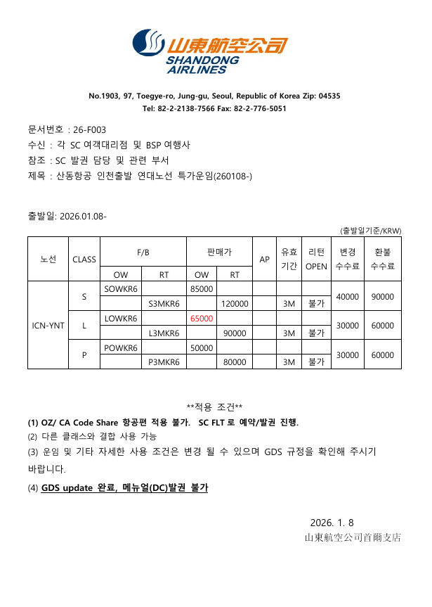 공문26-F003 산동항공 인천출발 연대노선 특가운임(260108-).docx