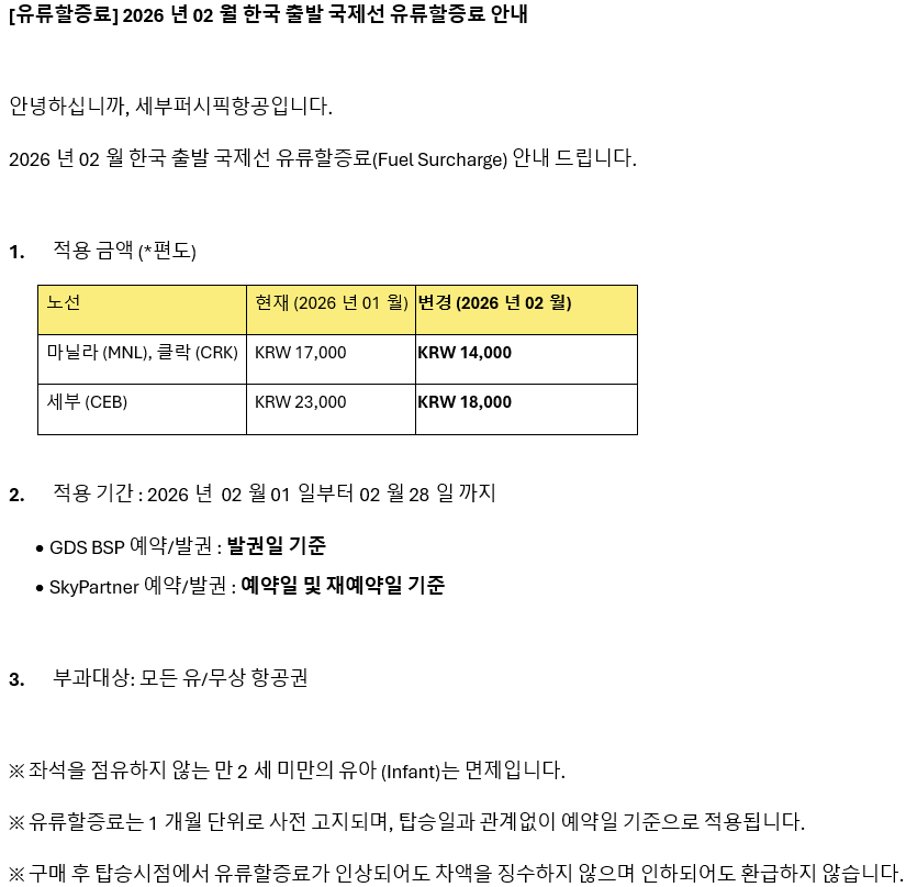 [유류할증료] 2026년 02월 한국 출발 국제선 유류할증료 안내