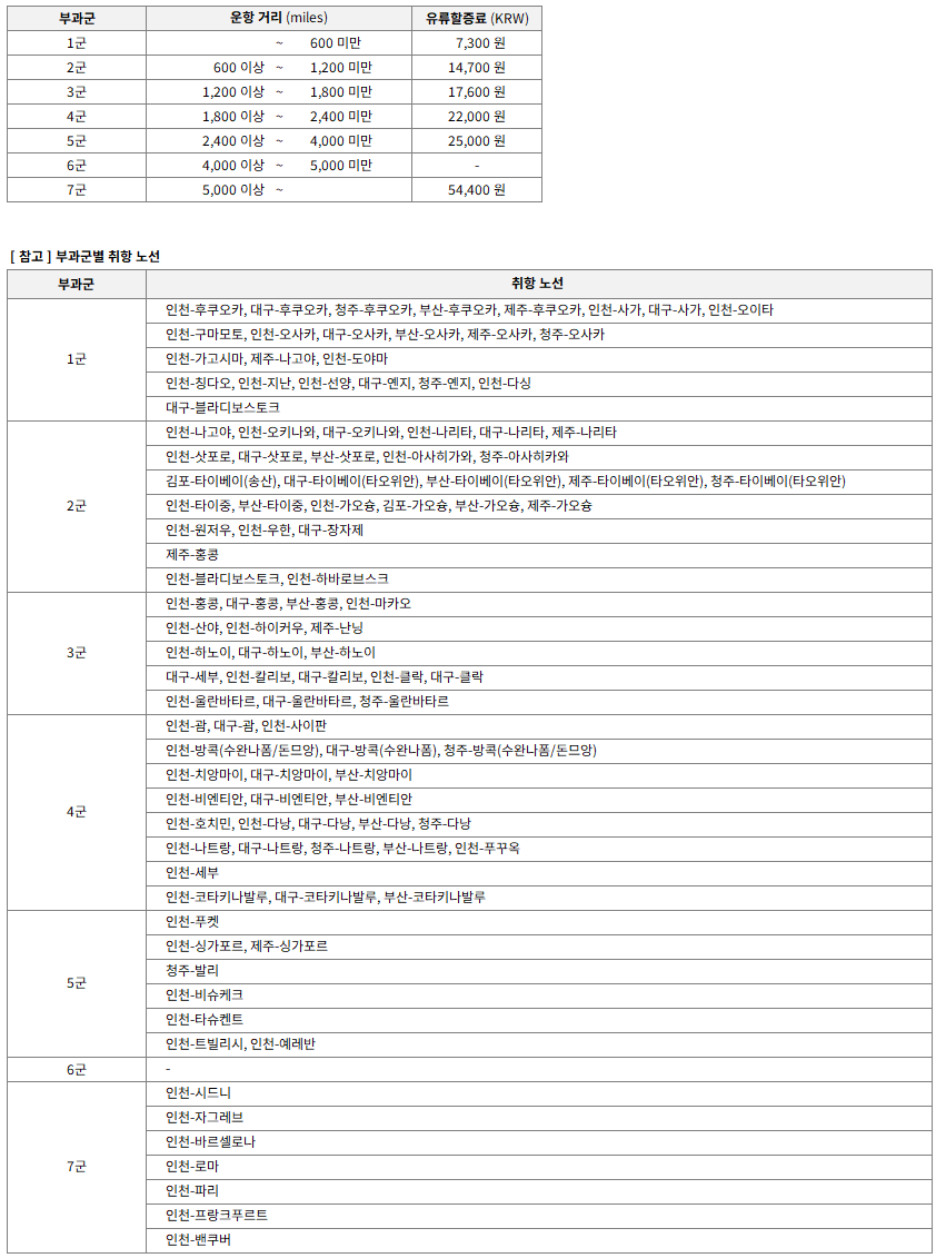 2. 대상 노선 및 유류할증료 (편도 기준으로 적용)
