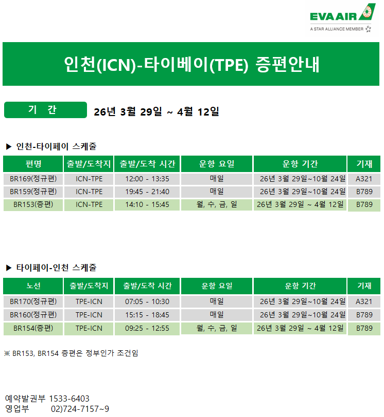 [에바항공] 인천-타이베이 노선 BR153/BR154 증편 운항 안내 (29MAR'26 ~ 12APR'26)