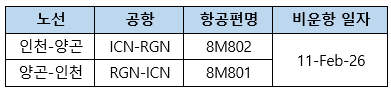 [필독]8M802/8M801편 인천-양곤/양곤-인천 구간 2월 비운항 안내 ( 2월11일 )