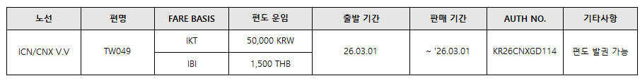 행복을 나르는 티웨이항공에서 다음과 같이 ICN/CNX 노선의 I CLS 특가를 안내드리오니 업무에 참고하시기 바랍니다. - 다 음 - 1. 노선별 판매 운임