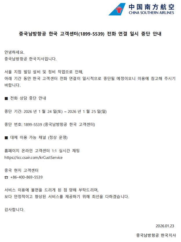 중국남방항공 한국 고객센터(1899-5539) 전화 연결 일시 중단 안내