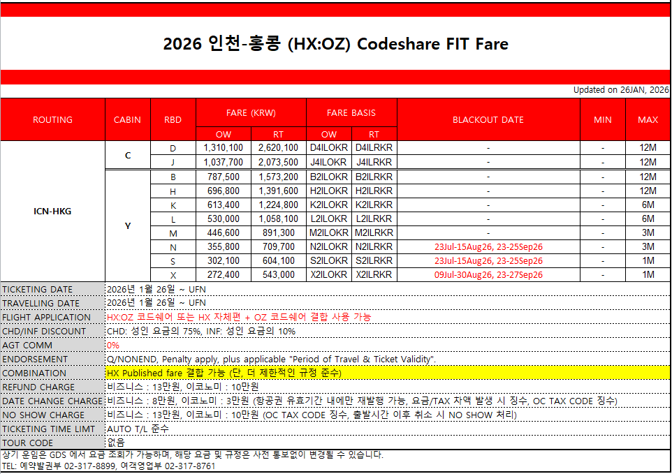 [홍콩항공] 인천-홍콩 HX:OZ (Codeshare Fare) 공동운항 운임 판매 재개 (2026.01.26~)