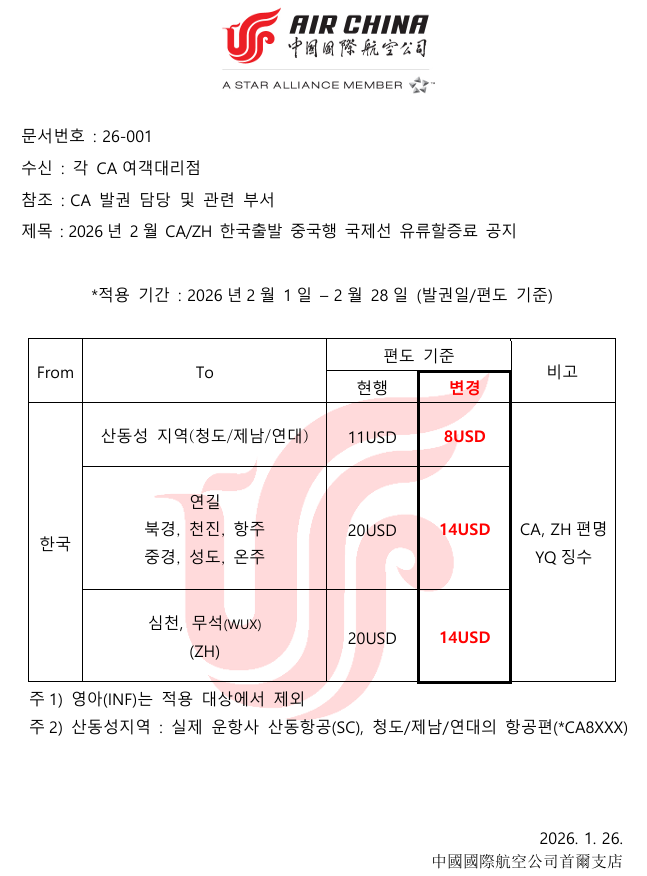 2026년 2월 CA,ZH 한국출발 중국행 국제선 유류할증료 공지