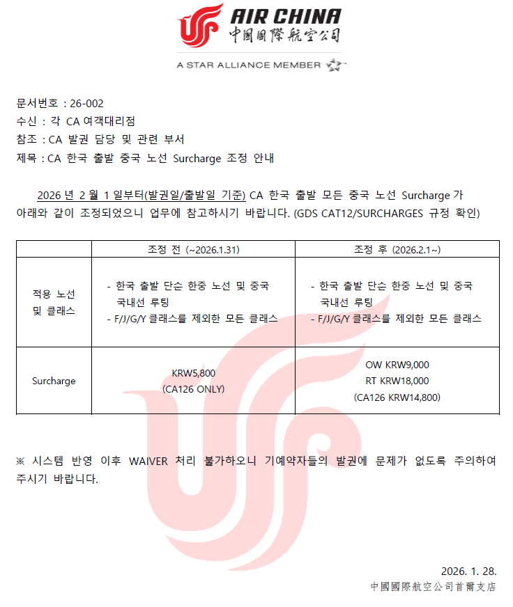 CA 한국 출발 중국 노선 Surcharge 조정 안내