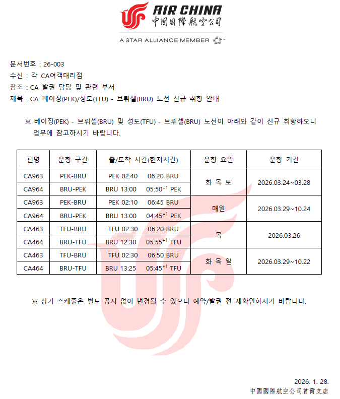 CA 베이징(PEK) / 성도(TFU) - 브뤼셀(BRU) 노선 신규 취항 안내