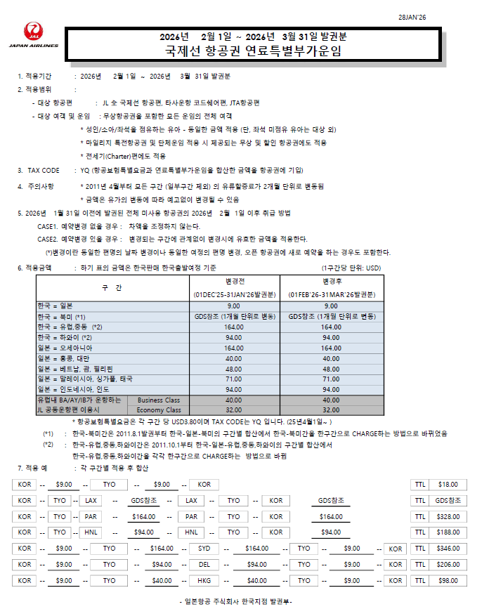 2026년 2월 1일 ~ 2026년 3월 31일 발권분 국제선 항공권 연료특별부가운임