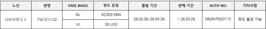 행복을 나르는 티웨이항공에서 다음과 같이 ICN/VTE 노선의 I CLS 특가를 안내드리오니 업무에 참고하시기 바랍니다. - 다 음 - 1. 노선별 판매 운임