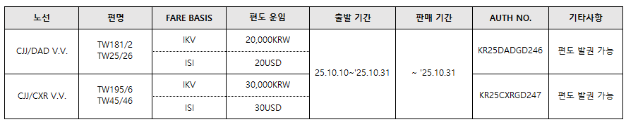 행복을 나르는 티웨이항공에서 다음과 같이 CJJ/DAD,CXR 노선의 I CLS 특가를 안내드리오니 업무에 참고하시기 바랍니다. - 다 음 - 1. 노선별 판매 운임