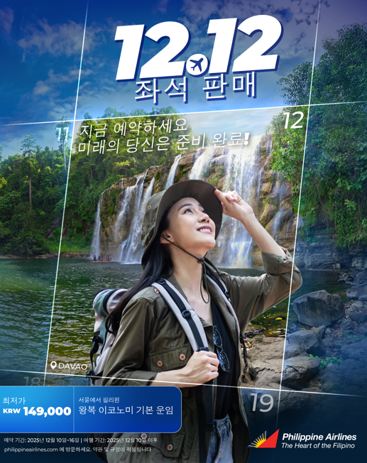[한국출발] 12.12 SEAT SALE1) 해당노선: KR - PH/BEYONDS2) 출발기간 : 2026년 3월 1일 ~ 2027년 3월 31일까지3) 프로모션 기간 : 2025년 12월 10일 ~ 12월 16일4) 비고: 운임은 시스템 참고 요청 드립니다.