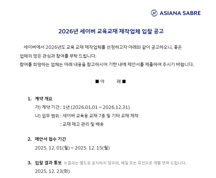 [공고] 2026년 세이버 교육교재 제작업체 입찰