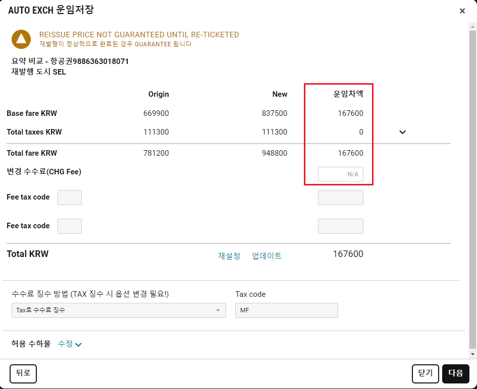 (Step 5) 운임 차액 및 재발행 수수료 확인 후 ''다음''