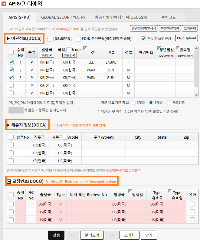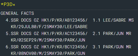 ▶ APIS : 3DOCS/P/KR/AB123456/KR/29JUL80/F/25MAY30/LEE/SABRE-1.1